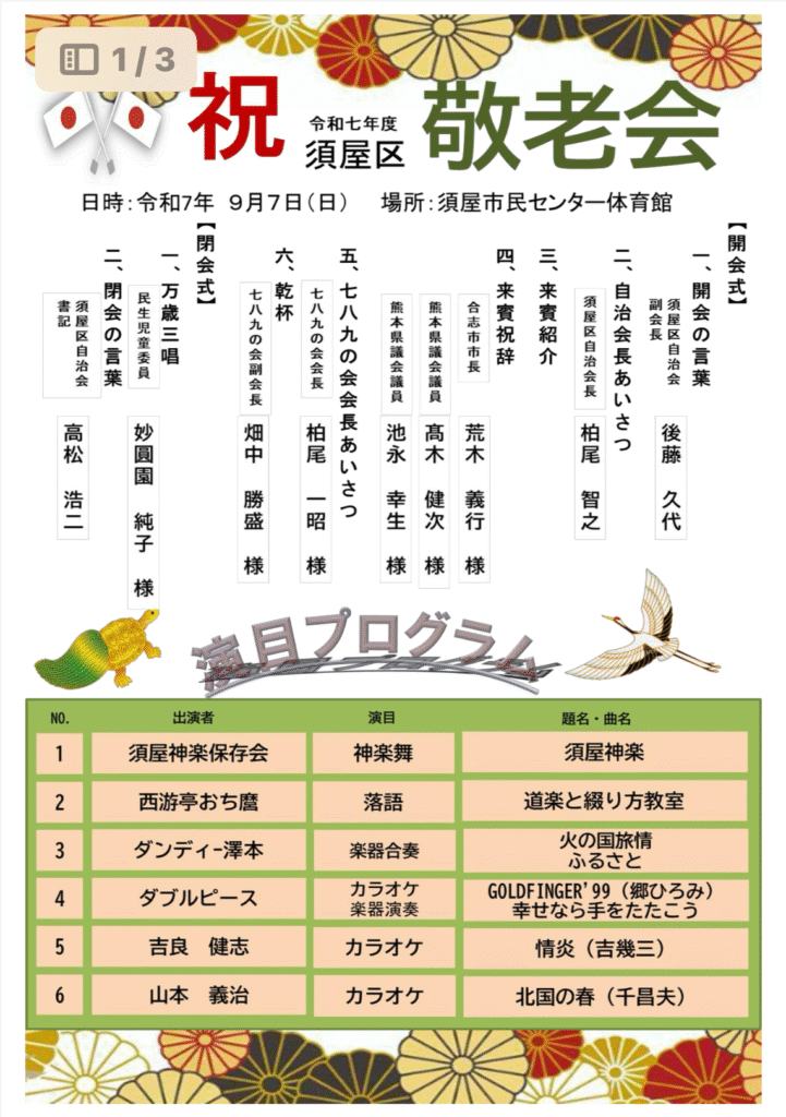 9月7日(日曜日)12時から須屋市民センターで須屋区主催の敬老会が催されました。