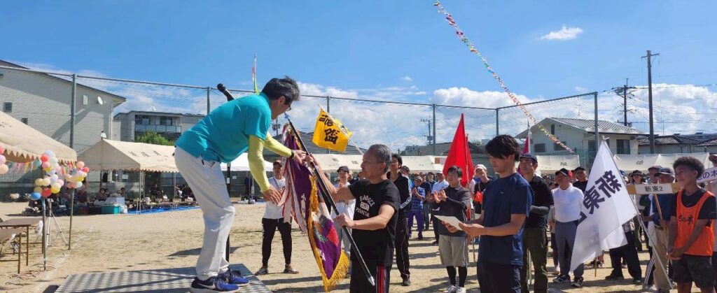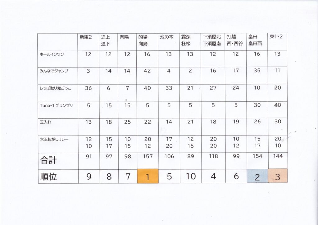 結果報告です。1位的場・向島組、初優勝本当におめでとうございます。わずか3点差で負けた2位の畠田・畠田西チーム。来年はいよいよ優勝か?❣ 3位は応援団長が張り切ってた東1・2組。チームワーク抜群でしたね。来年も頑張ってください。