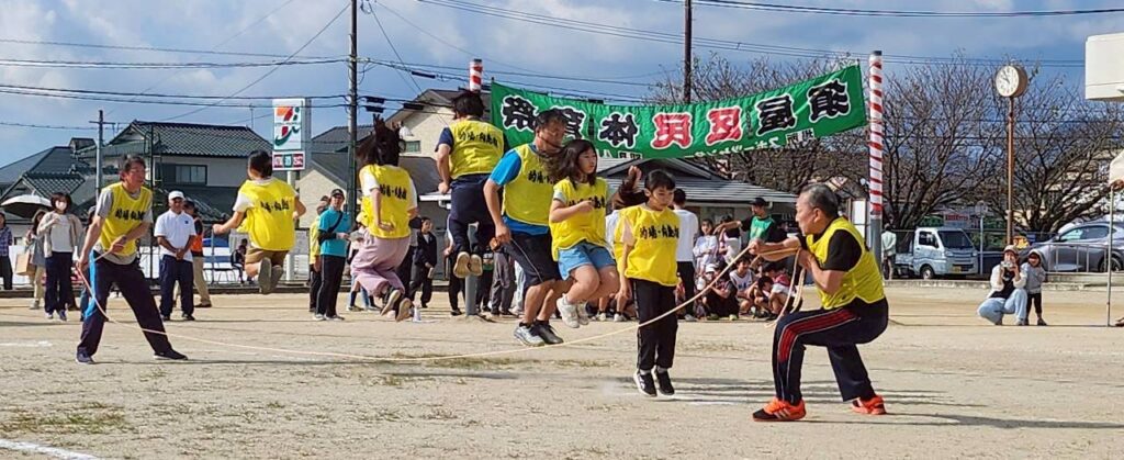 みんなでジャンプ、どのチームも一生懸命でしたが、的場・向島組は42回、畠田・畠田西チームは35回でこんなに回数多かったのは今までの体育祭で一番だったかも。2回くらい練習しただけで、息ぴったり、結局このチームが最終的に1位、2位を獲得したのでした