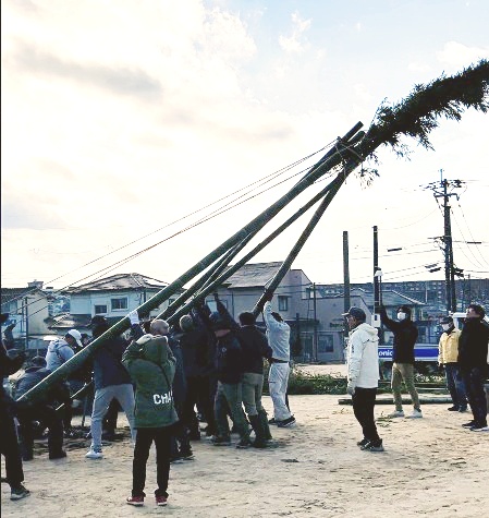 行われました。前日までの情報で、次第に風が強まるとのことでしたので、安全第一で高さや場所を考えて作られました。特にやぐらの組み方は育成部長がミニ模型で充分考えられたらしく、今年は楽にスムーズに立てられました。